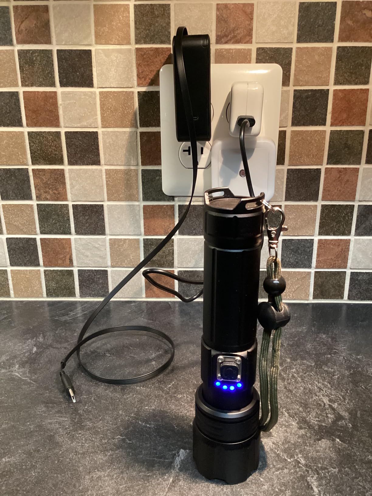 Outstanding light. No changing batteries; just plug its cable (provided) and charge it. Bright light. Very bright. And adjustable to a small area or a large area. I start with the large area first looks big for wildlife eyes then adjust to the smallest looking for the critter. One purchase, two flashlights; one for my car. One for the woods surrounding my home. I bought extras for Christmas gifts.